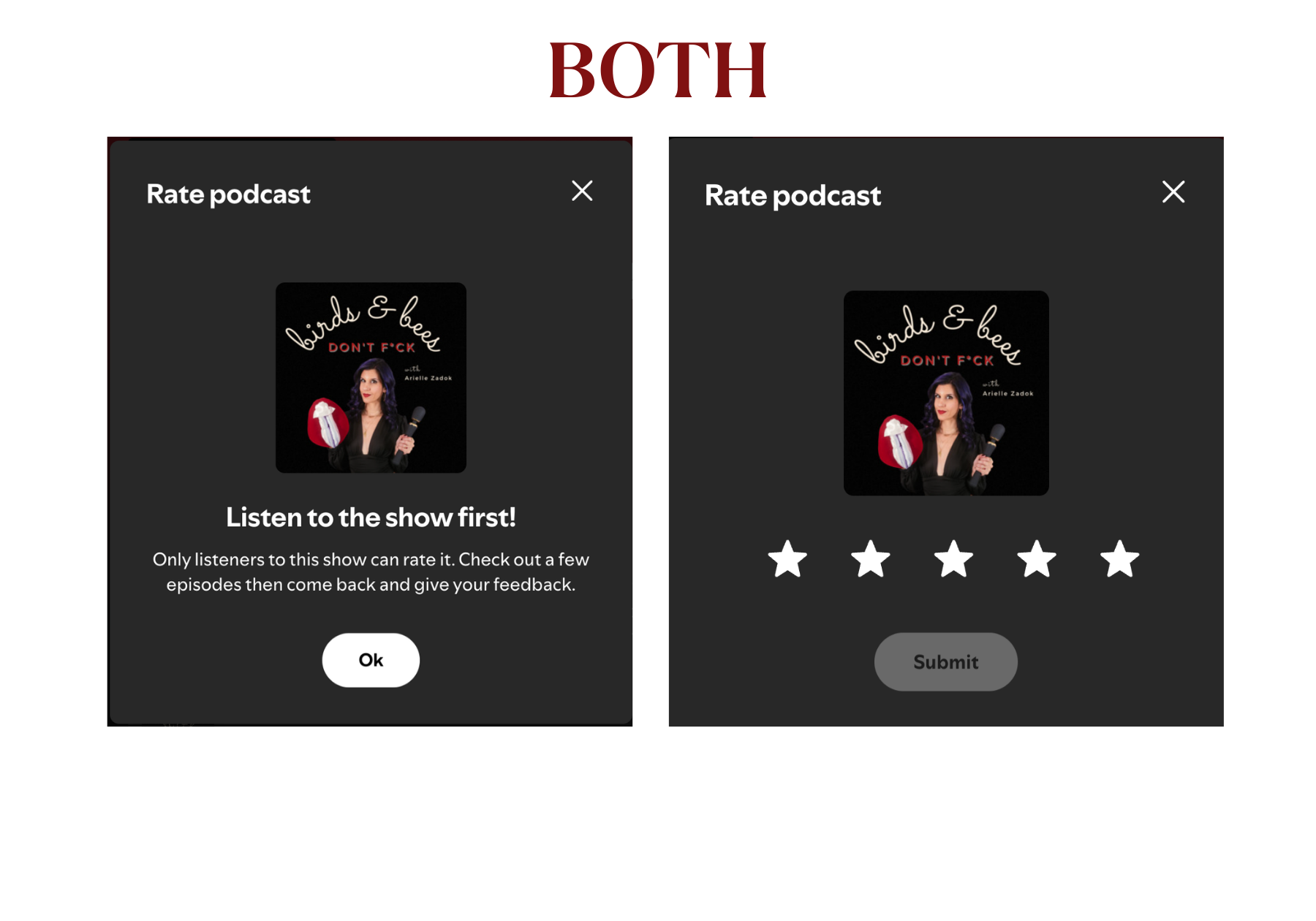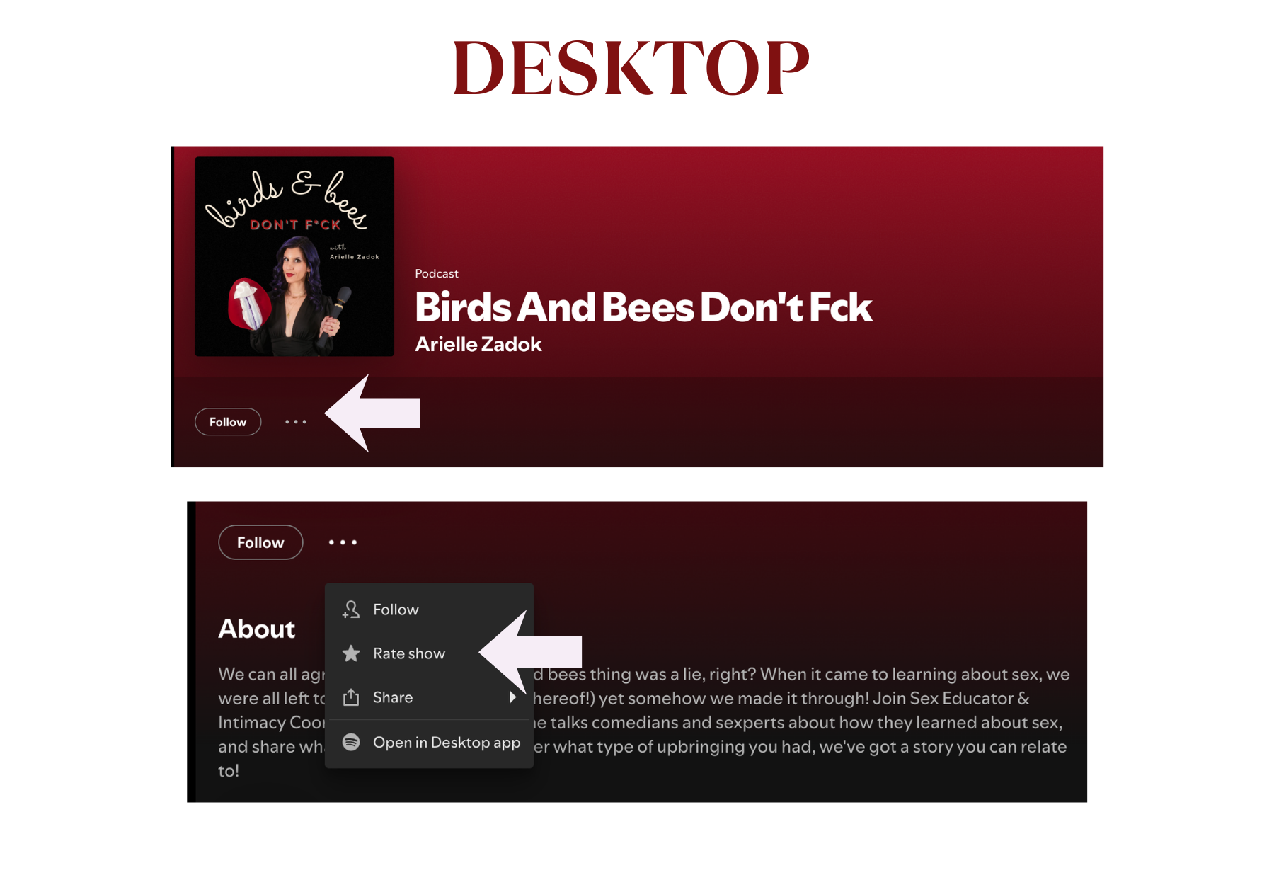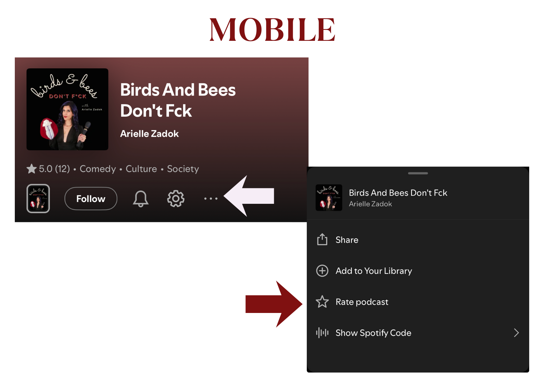 Use the button above to go to the show. Once there, you’ll see three dots all the way to the right, whether you’re on desktop or mobile. Click those opening up a menu of options. Click “rate show” on desktop or “rate podcast” on mobile. Both will make you listen before you rate, but once you do you’ll be able to give it a rating (5 stars, obviously).